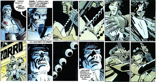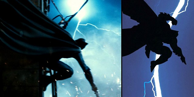 當蝙蝠俠準備要躲避毀滅日攻擊,用鉤槍暫時落在一個牆壁上,擺出來的動作剛好有一個閃電打下來,就形成了黑暗騎士歸來的經典漫畫封面。