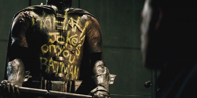 在蝙蝠俠即將迎接超人,並做為戰鬥的場地,牆上有許多高譚市超級惡棍的塗鴉,像是類似Joker(小丑)的文字,以及謎語人的問號標誌,而且地點又是高譚,偏偏也是蝙蝠俠用來決鬥的地點,想必這裡跟蝙蝠俠有一段歷史,或許這裡是亞克翰收容所的遺址?一切等電影回答~
