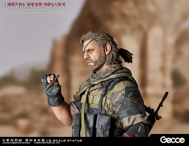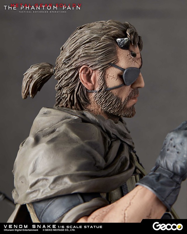 雖然逃過一死,但由於受到了爆炸嚴重的波及,Venom Snake 身上插滿了許多難以取出的彈片、人骨與牙齒,並且還有一枚金屬破片插入右額頭骨之中,導致其容易看見幻覺或色盲。 這次所發行的作品將完整地重現“毒蛇”在遊戲中的造型,並藉由Gecco 精湛的製作技術細緻、生動地刻畫出所有細節。