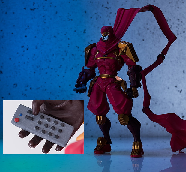 當然還有忍者必備的攀爪勾、手裡劍或是特效等等的配件,在圍巾的部分有多處的關節來表現其飄逸的感覺,部分也使用「軟材質」來確保其更大的可動範圍程度,另外在ebten官網預定此商品多付有限定特典,是一個電視遙控器的配件,提供給喜愛《忍者殺手》系列做的玩具人參考。