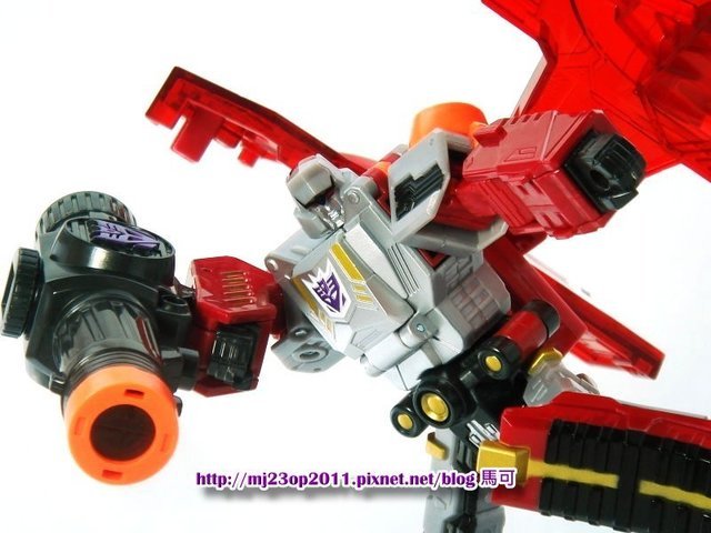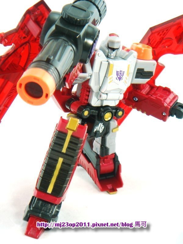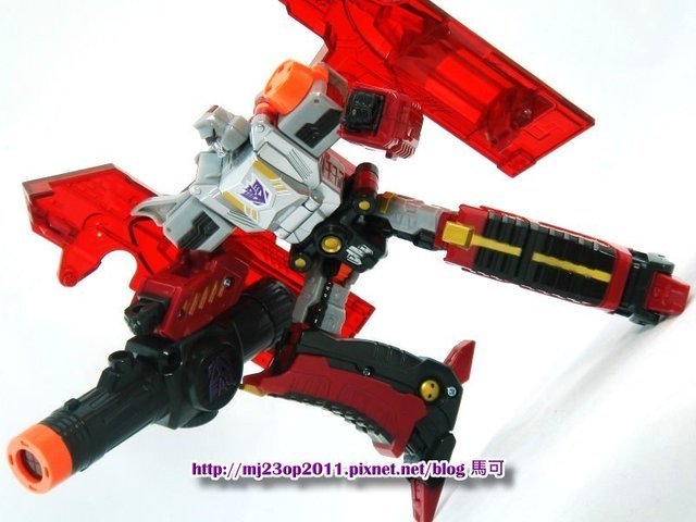 個人覺得在變形上的前段過程很有趣,就敗在最後用背後的兩片翅膀來打完收工...不過那兩片翅膀倒是沒有影響多少可動,右手的大炮又大的銷魂,基於對大帝的崇拜,小弟也沒有漏掉任何一次再版~握在手上的尺寸很合,經過近年的第三方高難度變形後,覺得這樣的變形難度不高才真的會常常拿起來把玩...也可能因為小弟老了QQ。