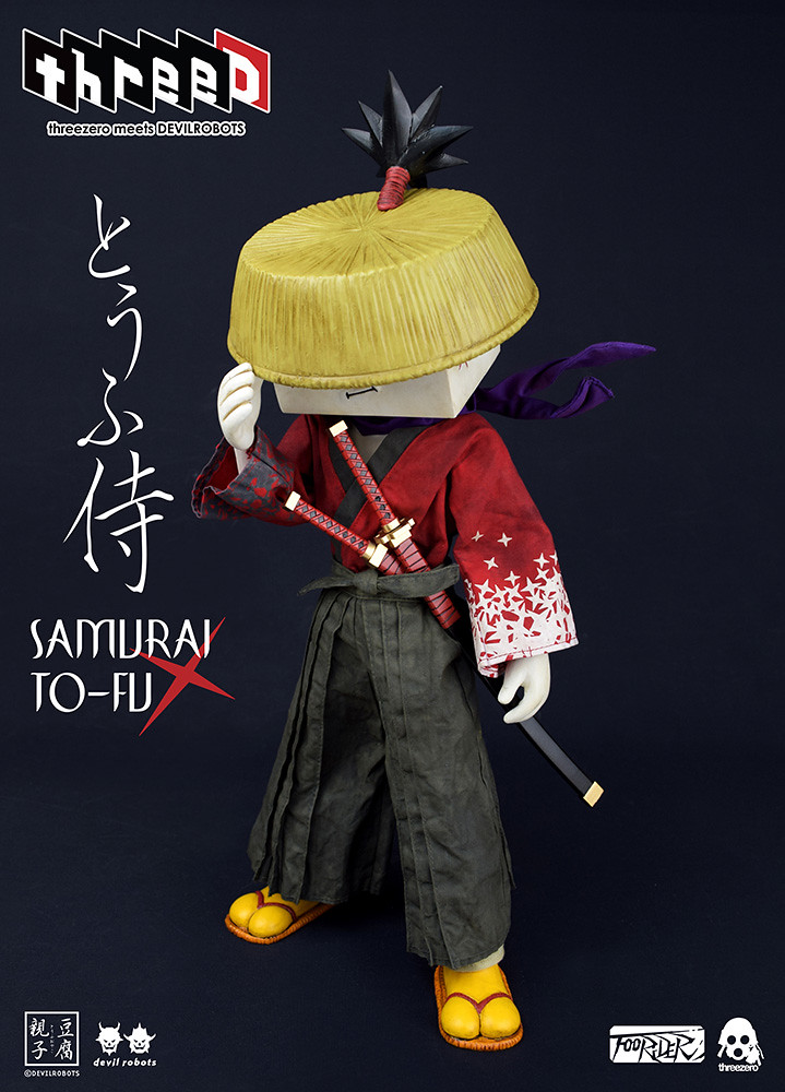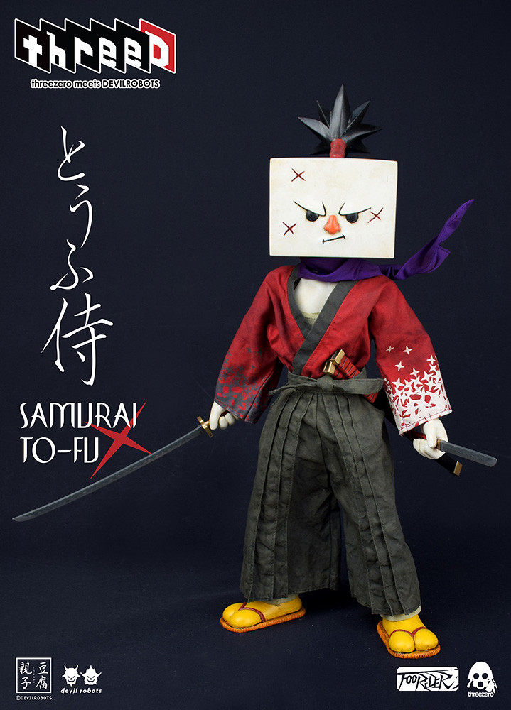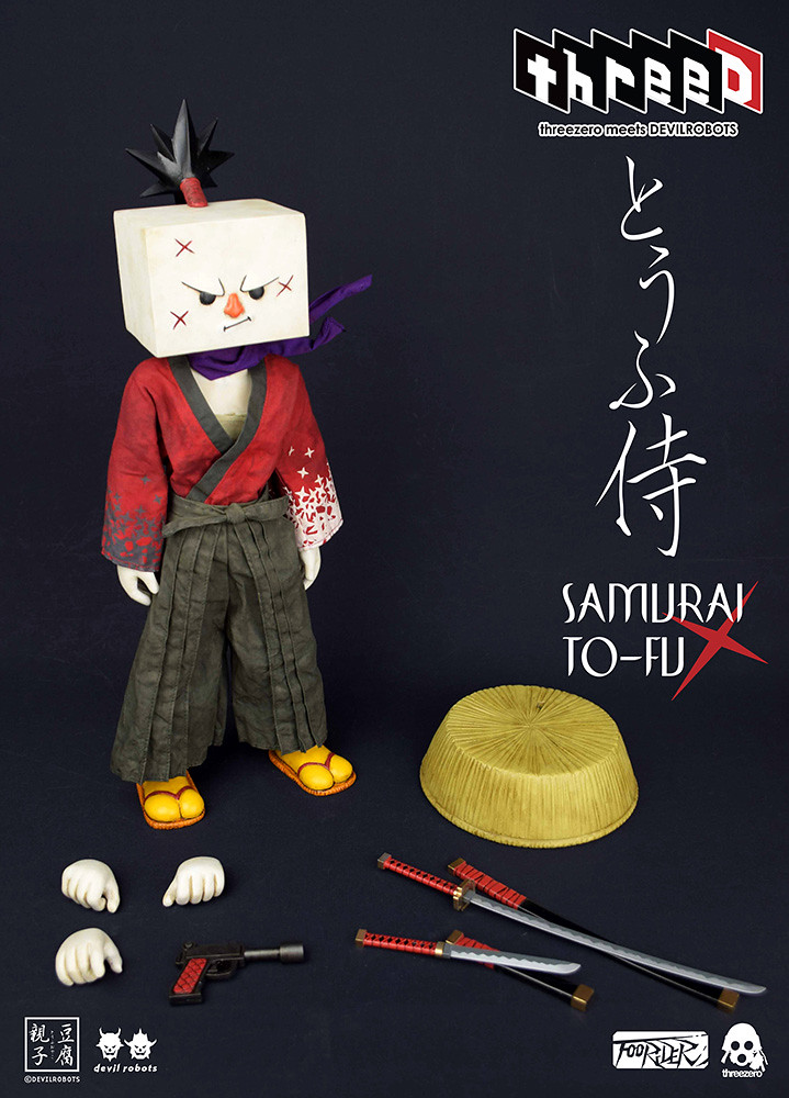 「豆腐武士」(Samurai TO-FU)採用1/6 比例製作,全高15英寸/ 38.1公分,使用了特別訂製的精緻手工裁縫服飾、斗笠,用來搭配Devil Robots 所設計、極具風格特性與個性的豆腐頭雕。除了精彩的人偶造型之外,還搭配了大量豐富的配件與武器:武士刀、脅差(與武士刀搭配的小短刀)以及一把火槍;另外還附屬了五款不同的手部替換零件,以及豆腐武士忠心的青蛙助手(附帶背包及兩對可交換手型)。