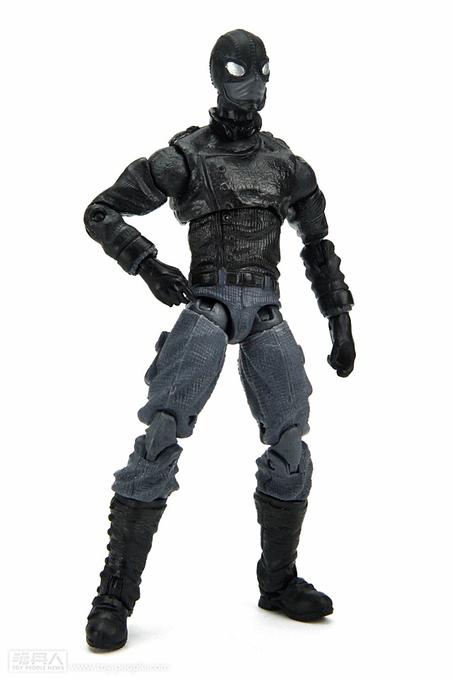 ▼ 擁有一身酷黑的黑夾克、牛仔褲以及皮頭套的“暗影蜘蛛人”,是平行世界Earth-90214 1930年代時的彼得帕克。在這個以美國經濟大蕭條年代為主題的1930年代世界,班叔被諾曼‧奧斯朋所率領的犯罪組織所殺,而彼得在遭到一隻神秘的蜘蛛咬了之後獲得了特殊的力量,並且遭到該平行世界中的J. Jonah Jameson (號角日報總編)誣陷為謀殺兇手。