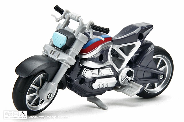 ▼ 同捆組合中所附的機車,厚重的灰黑車身搭配上紅、藍裝飾,並且使用銀色的塗裝來強調金屬的效果,使其更加搶眼。 除了騎乘的模式之外,也附屬了能夠讓摩托車停泊的斜架。
