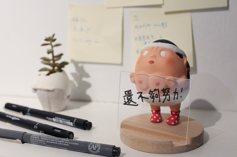 荷包蛋妞前方壓克力板,可在上方書寫文字或黏貼便條紙(也可放置手機或名片),為生活發聲一下!藉此吸引大家目光。