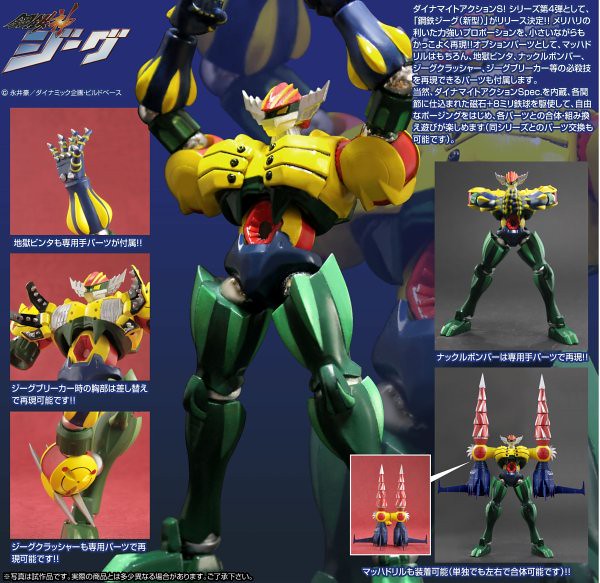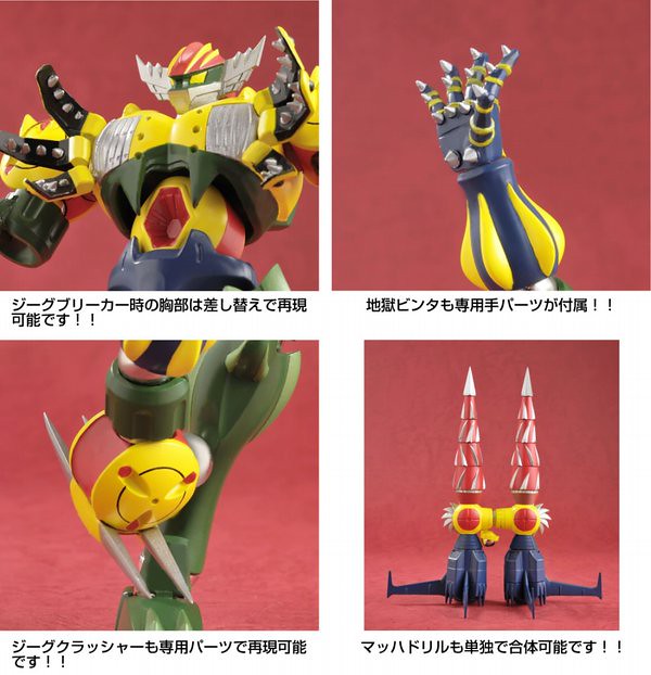 作品附有動畫劇情所出現的武器「馬赫鑽」マッハドリル、「地獄掌擊」地獄ビンタ、「關節轟炸機」ナックルボンバー用手パーツ和「吉克粉碎擊」ジーグクラッシャー等等多款配件,讓玩家可以交互替換配件更有其趣味把玩的特性,越來越多廠商都將可動玩具相關的作品都縮小尺寸,在縮小尺寸後強調的是作品精緻的程度和可動範圍等等,不知道玩具人覺得如何呢?