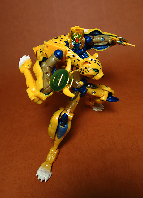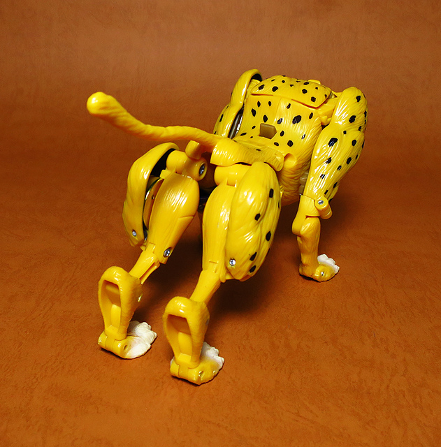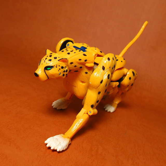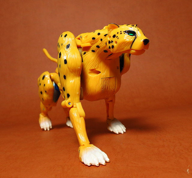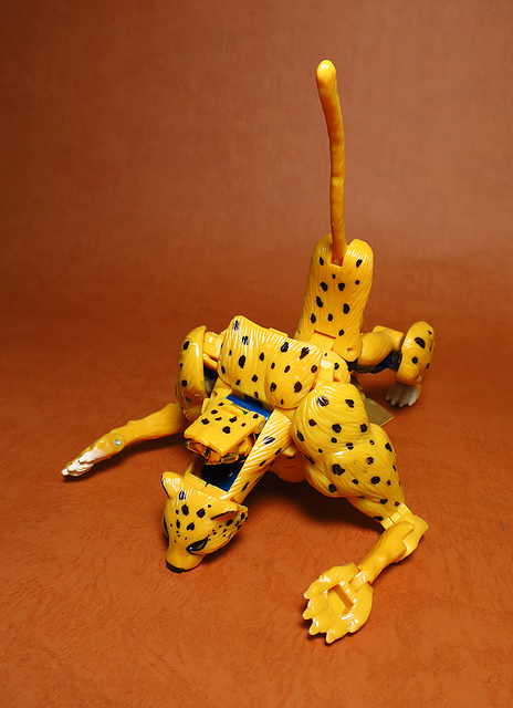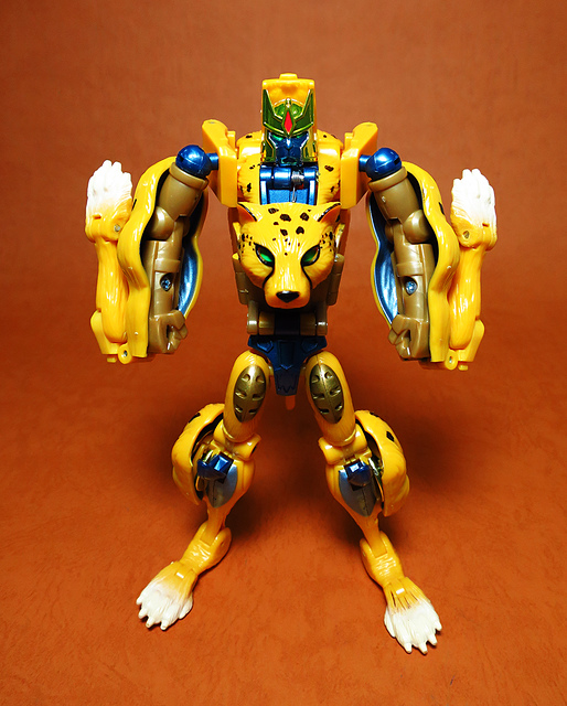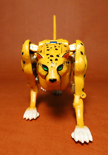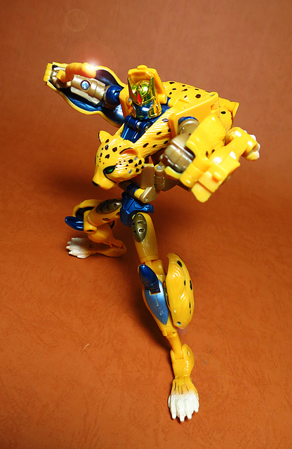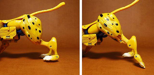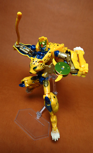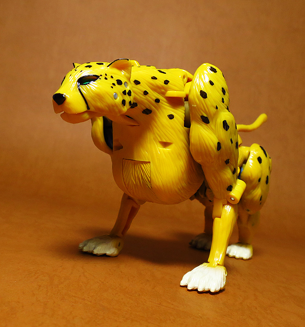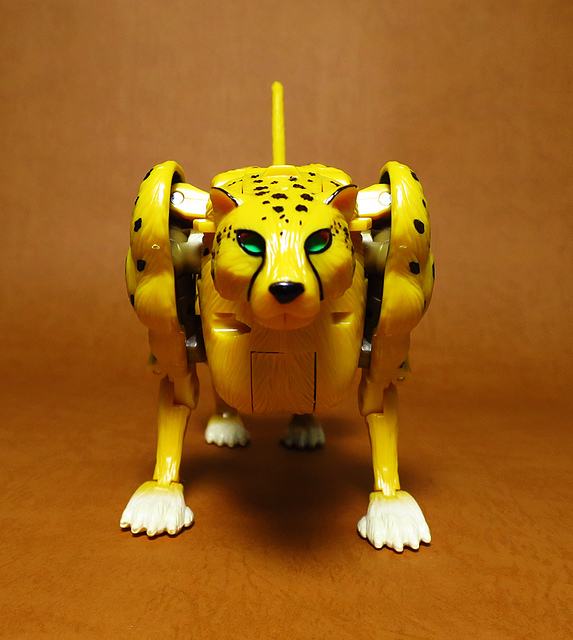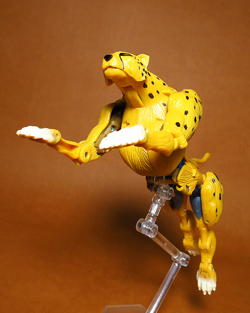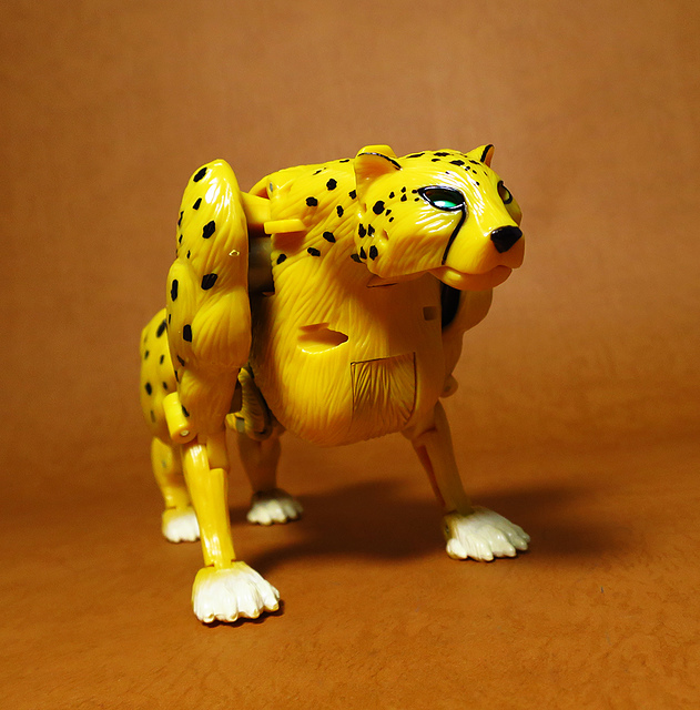 作為Beast Wars的核心角色,豹子終於在適逢變形金剛25周年之際,獲得了新生的契機,於美版的Universe系列、以及日版的Henkei!系列中,呈現出全新設計的經典樣貌。然而,備受玩家注目的結果,換來的卻是「期望越大,失望也大」,這款豹子的模組,在機器人形上有著比例失衡的問題,手臂除了長度不足,肘部的可動也受到嚴重的干涉,可說是這個模具中最讓人惋惜的部份,幸好,變形後的印度豹模式,表現還算是讓人滿意,除了過度厚實的胸口讓我有些訝異,四肢關節的設置和可動方向也都還算是符合實際的生物表現,在適當的調整下還是可以擺出大貓般的姿態,至於張嘴及變眼的機關,若能經由卡榫加以固定,想必在擺設上能有著更多的變化。