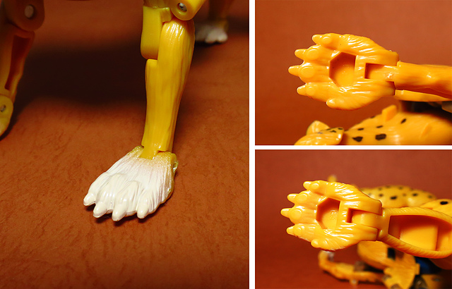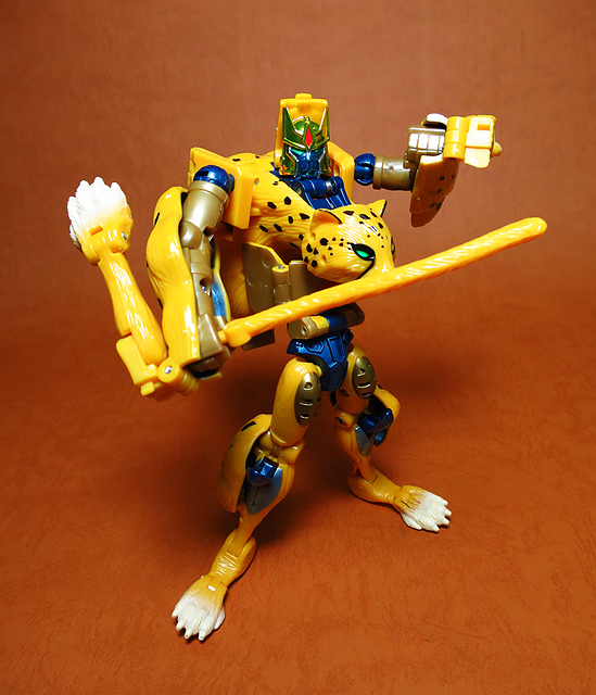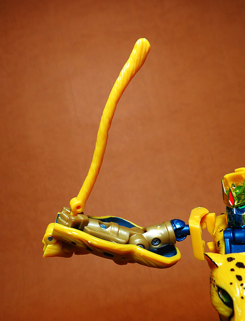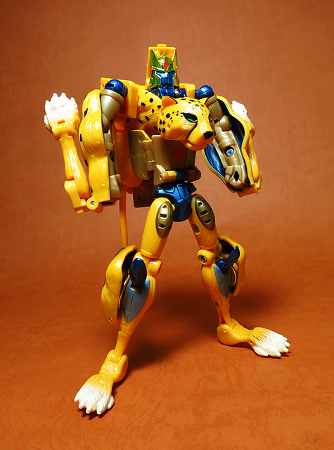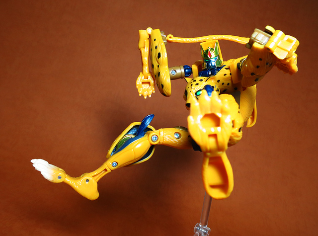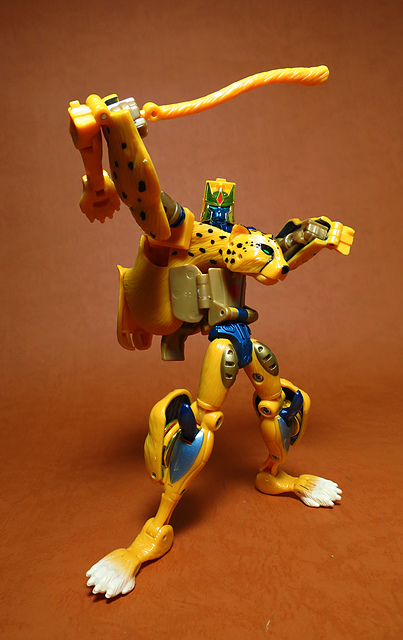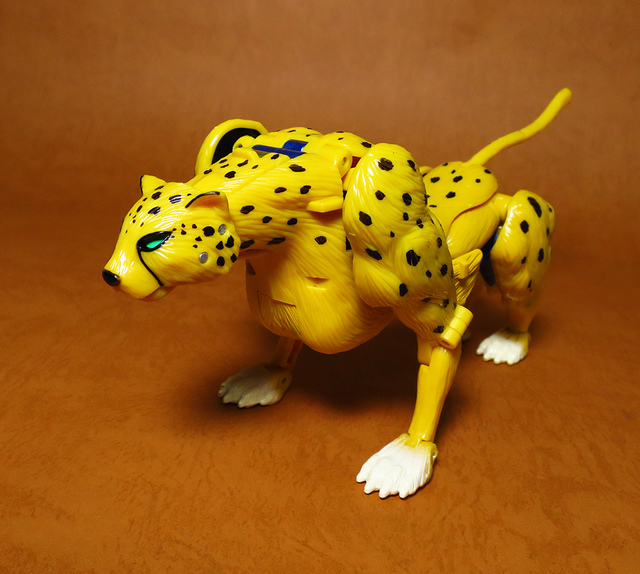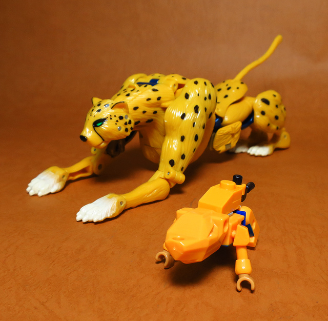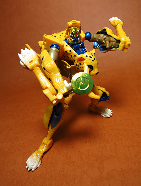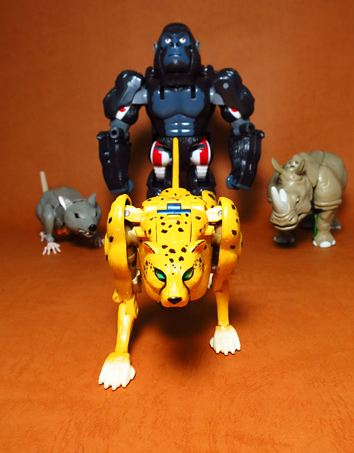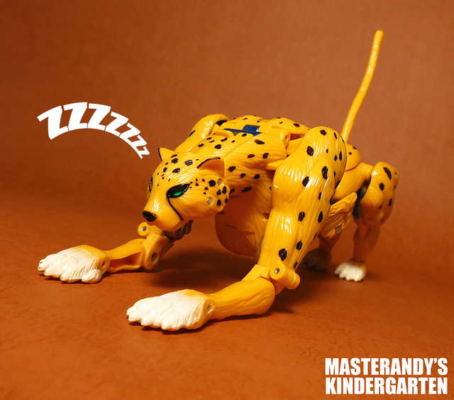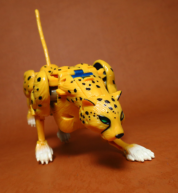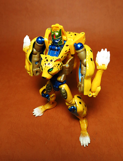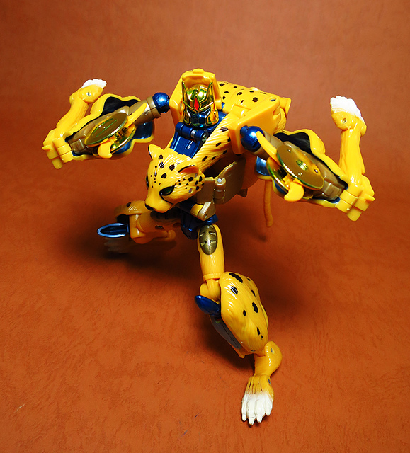 作為Beast Wars的核心角色,豹子終於在適逢變形金剛25周年之際,獲得了新生的契機,於美版的Universe系列、以及日版的Henkei!系列中,呈現出全新設計的經典樣貌。然而,備受玩家注目的結果,換來的卻是「期望越大,失望也大」,這款豹子的模組,在機器人形上有著比例失衡的問題,手臂除了長度不足,肘部的可動也受到嚴重的干涉,可說是這個模具中最讓人惋惜的部份,幸好,變形後的印度豹模式,表現還算是讓人滿意,除了過度厚實的胸口讓我有些訝異,四肢關節的設置和可動方向也都還算是符合實際的生物表現,在適當的調整下還是可以擺出大貓般的姿態,至於張嘴及變眼的機關,若能經由卡榫加以固定,想必在擺設上能有著更多的變化。