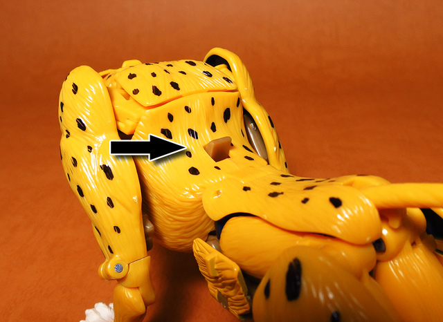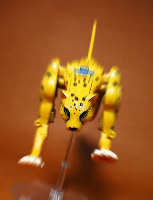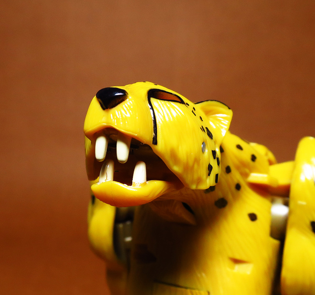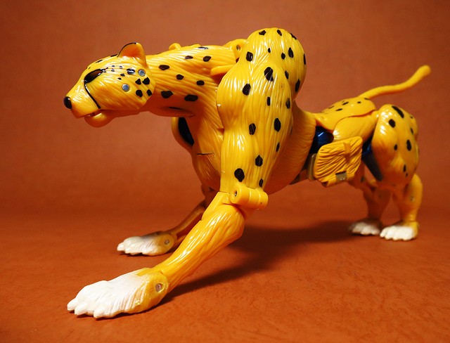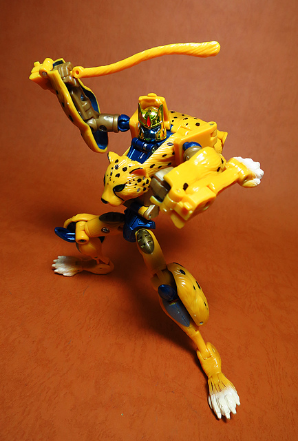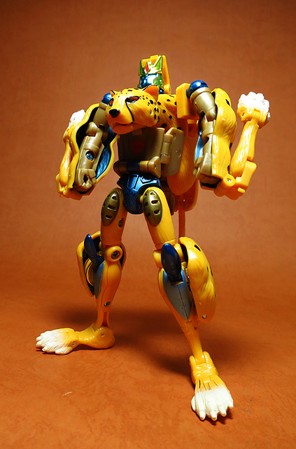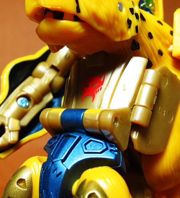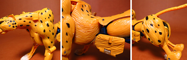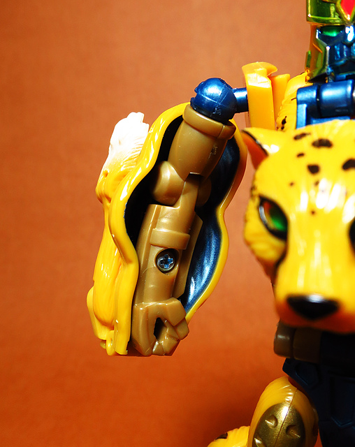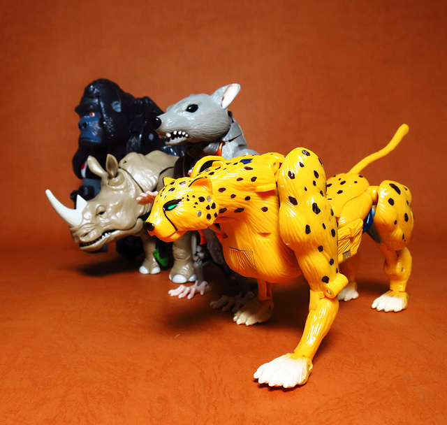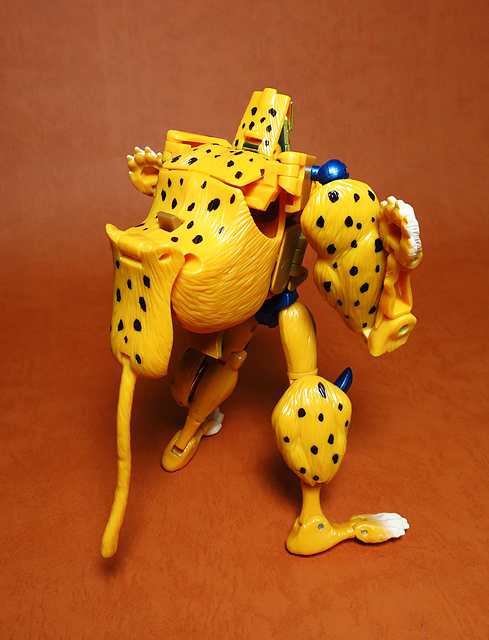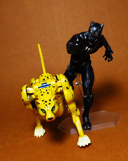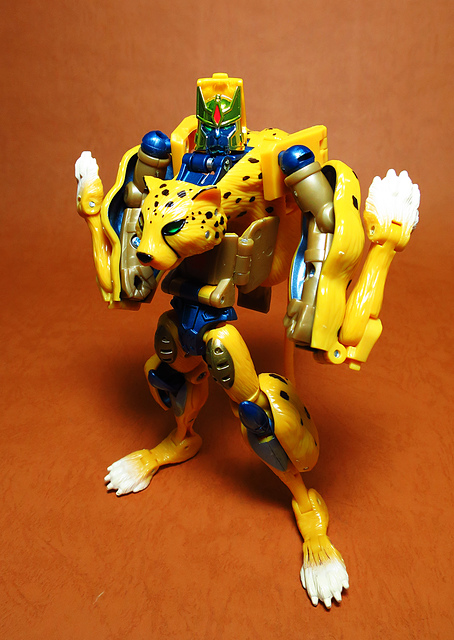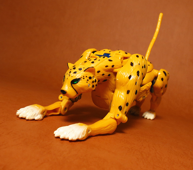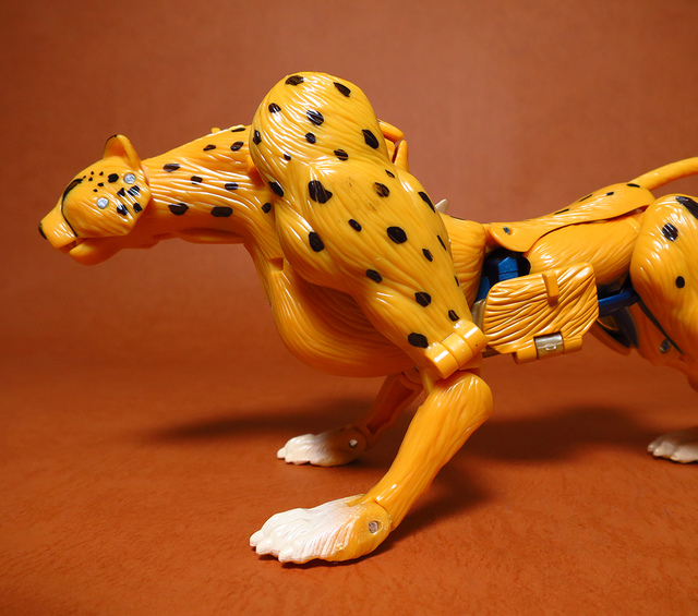 作為Beast Wars的核心角色,豹子終於在適逢變形金剛25周年之際,獲得了新生的契機,於美版的Universe系列、以及日版的Henkei!系列中,呈現出全新設計的經典樣貌。然而,備受玩家注目的結果,換來的卻是「期望越大,失望也大」,這款豹子的模組,在機器人形上有著比例失衡的問題,手臂除了長度不足,肘部的可動也受到嚴重的干涉,可說是這個模具中最讓人惋惜的部份,幸好,變形後的印度豹模式,表現還算是讓人滿意,除了過度厚實的胸口讓我有些訝異,四肢關節的設置和可動方向也都還算是符合實際的生物表現,在適當的調整下還是可以擺出大貓般的姿態,至於張嘴及變眼的機關,若能經由卡榫加以固定,想必在擺設上能有著更多的變化。
