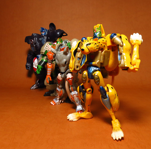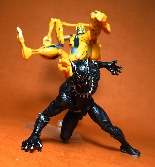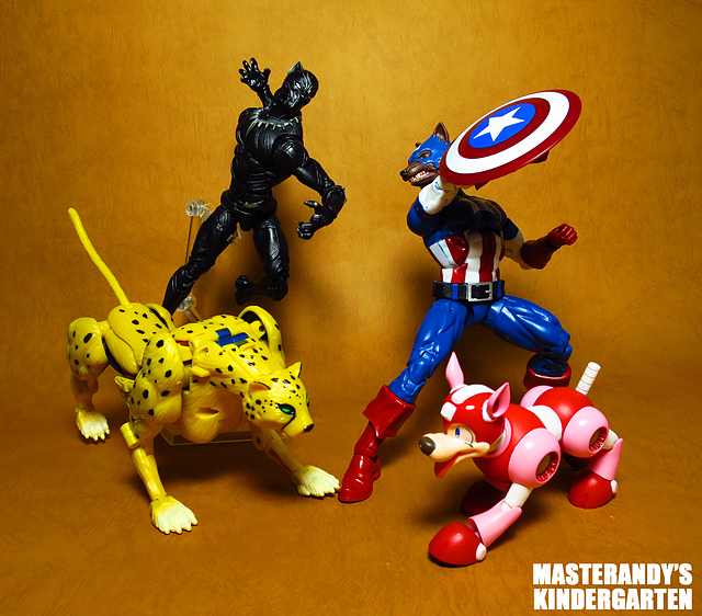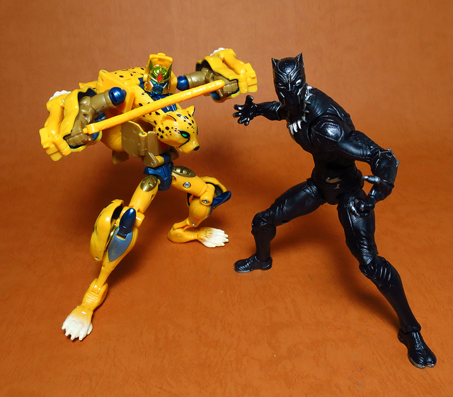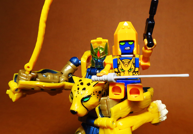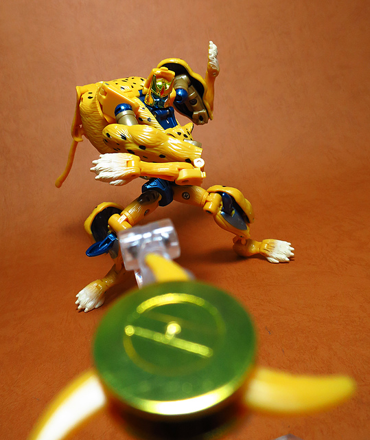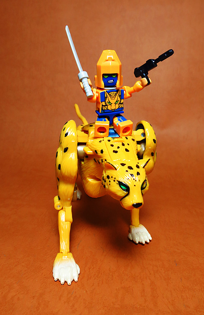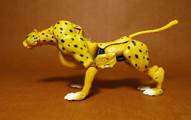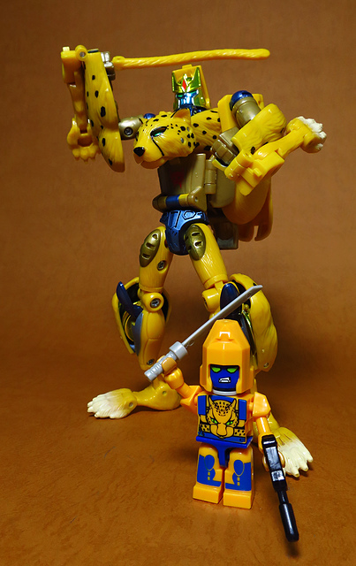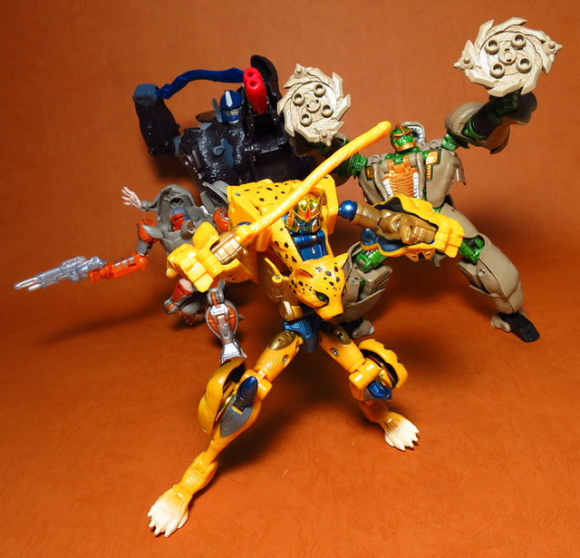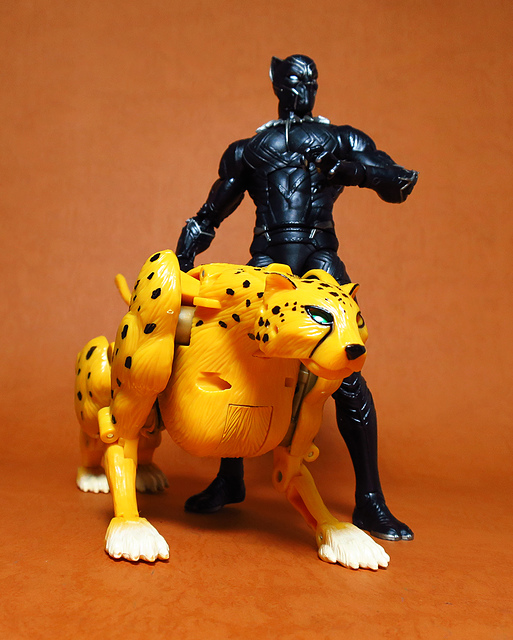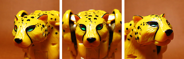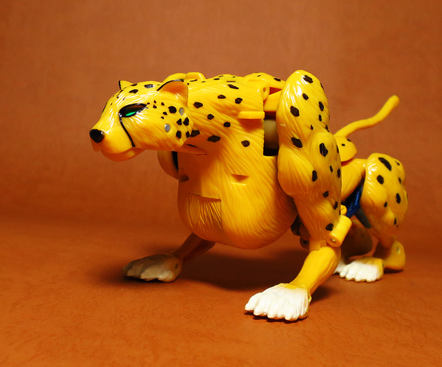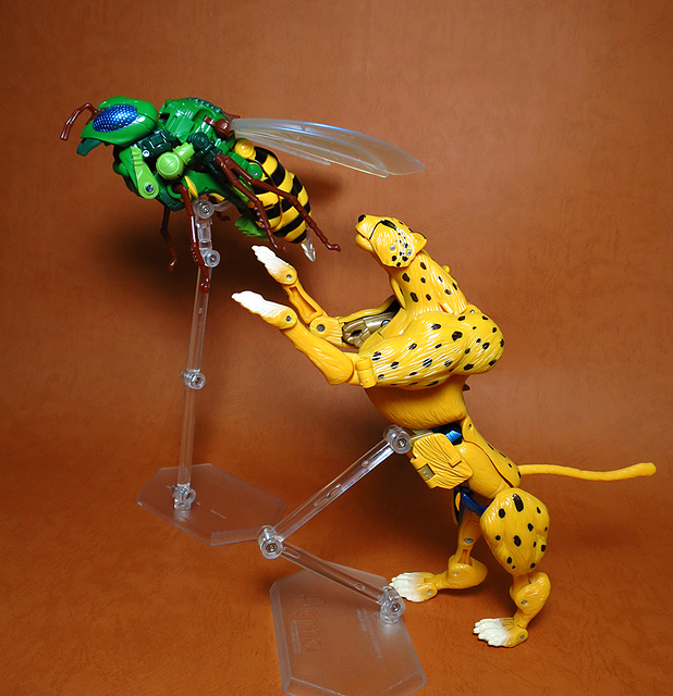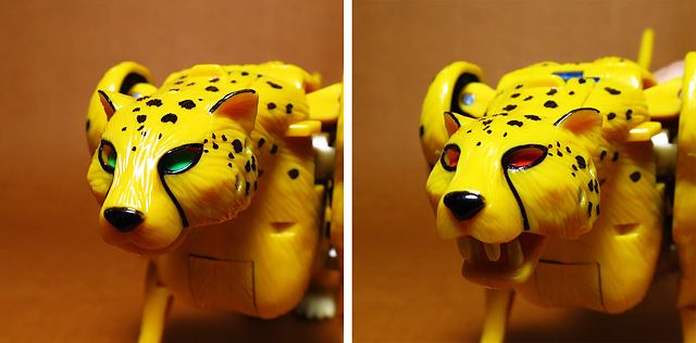 作為Beast Wars的核心角色,豹子終於在適逢變形金剛25周年之際,獲得了新生的契機,於美版的Universe系列、以及日版的Henkei!系列中,呈現出全新設計的經典樣貌。然而,備受玩家注目的結果,換來的卻是「期望越大,失望也大」,這款豹子的模組,在機器人形上有著比例失衡的問題,手臂除了長度不足,肘部的可動也受到嚴重的干涉,可說是這個模具中最讓人惋惜的部份,幸好,變形後的印度豹模式,表現還算是讓人滿意,除了過度厚實的胸口讓我有些訝異,四肢關節的設置和可動方向也都還算是符合實際的生物表現,在適當的調整下還是可以擺出大貓般的姿態,至於張嘴及變眼的機關,若能經由卡榫加以固定,想必在擺設上能有著更多的變化。