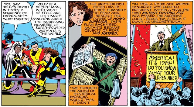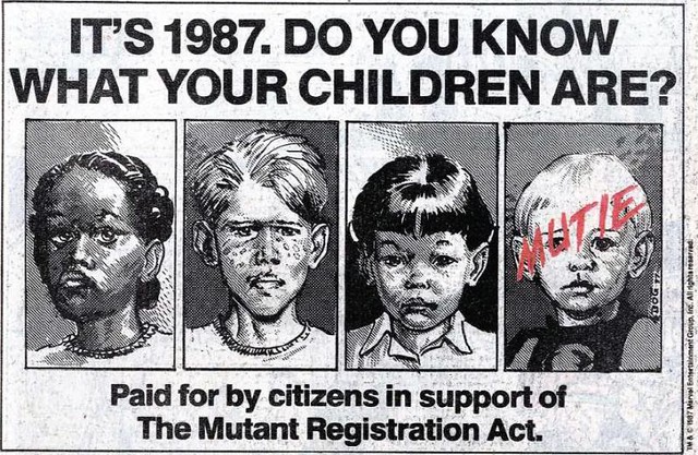 Mutant Registration Act(突變人註冊法案)-之前凱利議員免於被暗殺的命運,雖然是由本身也是突變人的X戰警所拯救,但畢竟策劃殺害他的人也是突變人,所以凱利對於突變人需要嚴格管理的看法仍然沒變。這次他修改了突變人控制法案,使得不會跟憲法有牴觸(這個立法的出現,也是導致獨眼龍和琴˙格雷,決定組成X-Factor小隊的其中一個重要原因),而形成了突變人註冊法案。