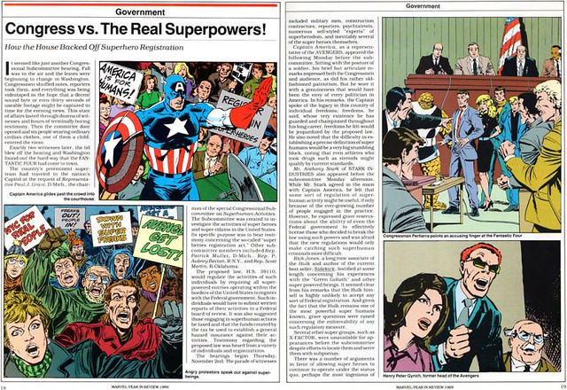 Super-human Registration Act(超級人類註冊法案)-在大事件Acts of Vengeance期間,驚奇四超人到國會,去調查委員會的超級人類註冊法案。驚奇先生在國會中辯論道,這項法案是不必要的,因為大多數成為超級英雄的超人類,他們多年來的行為已經足夠證明自己,所以才會獲得民眾相當大的信賴,政府這樣做只會使得這些英雄抑制保護世界的能力。