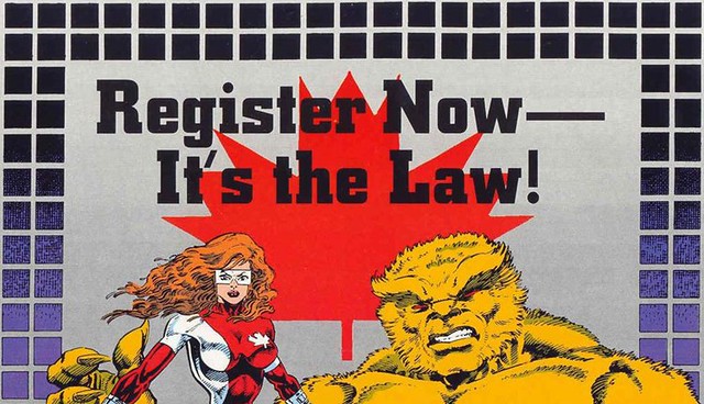 Canadian Super-powers Registration Act(加拿大超級能力註冊法案)-這是由加拿大政府部長羅伯特‧哈根所推廣的法案,同時這也是超級罪犯Master錯綜複雜計劃的一部分。條款中規定凡是在加拿大的超人類都必須成為政府特工,由政府處理超人類相關問題的Department H部門來徵選,選上的超能力者就會變成Flight(飛行隊)計畫中的超級英雄團隊的成員,如Alpha Flight(阿爾法飛行隊)。