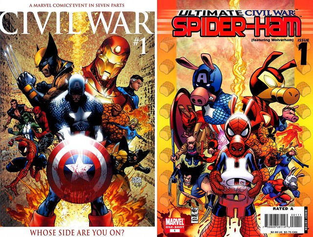 *蜘蛛人雖然在內戰時,用記者會向大眾公開其身分,但卻也為此遭到金賓僱來的殺手狙殺梅嬸。為了救回自己的嬸嬸,彼得犧牲他和瑪莉珍的婚姻,跟惡魔梅非斯托訂契約,來換取原本的秘密身份救回梅嬸,所以變成只有查閱蜘蛛人曾因為註冊所留下的資料,才能得知其真實身分。接下來介紹的是漫威平行世界和其他出版社作品的註冊法案。
