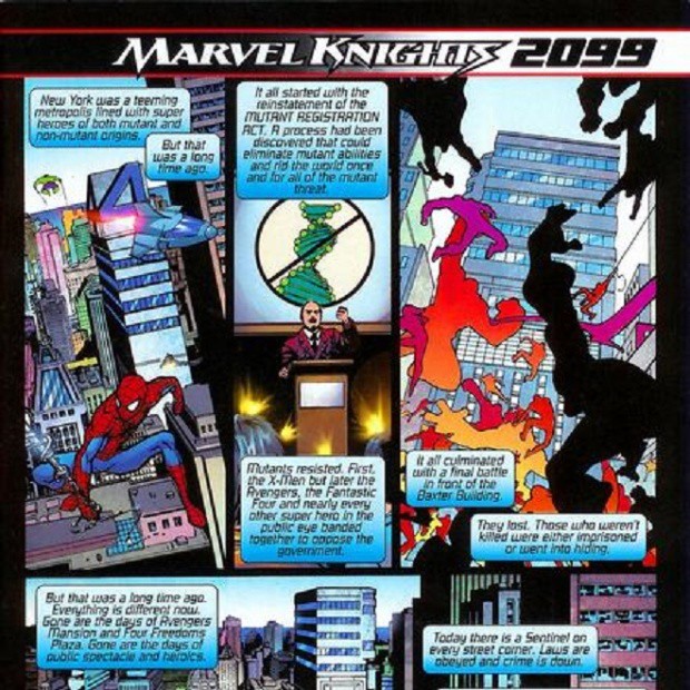 Marvel Knights: 2099版的世界觀-在這個時空中,突變人註冊法案再度實施,雖然這並非針對所有的超人類,但由於情份和人權的關係,導致從突變人對抗政府的戰爭,進而提升成超人類對抗政府的戰爭,最後政府勝利,註冊法成功推行,所有的超級英雄轉為地下活動。