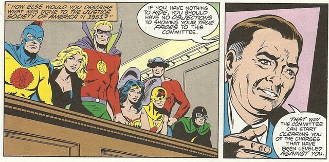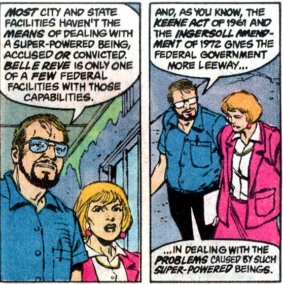 DC的超級英雄正史世界-在1951年,正義會社JSA因麥卡錫主義的關係,不想在美國委員會的命令下,將秘密身分給公開而選擇自我解散。這個法案參考了守護者故事中的Keene Act(基恩法案),除非你跟政府註冊並公開其身分,不然私底下打擊犯罪就算犯法。