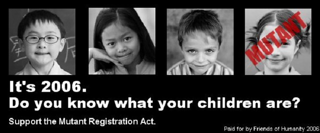 X戰警電影世界觀-在這時空理,突變人註冊法案由凱利參議員主導並提議,法案內容提到允許政府可以統計突變人的人口數量、能力是什麼,以及追蹤他們。但隨後萬磁王綁架凱利參議員,並由魔形女假裝參議員而將其取消,接著凱莉參議員就死去。不久之後,William Stryker(威廉‧史崔克)洗腦了夜行者,進行刺殺總統的假攻擊,讓突變人註冊法案又有重新啟動的機會,但最後在X戰警處理掉史崔克的陰謀後,X教授說服了總統才又被取消。