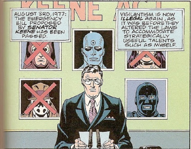 守護者世界觀-由於蒙面英雄打擊罪犯的活躍,導致在1977年時發生了一場紐約警察和其家屬罷工暴動的事件。於是政府推出Keene Act(基恩法案),禁止沒註冊該法案的蒙面英雄繼續私下打擊犯罪,否則就會被逮捕。這導致許多守護者世界觀中的超級英雄選擇退休,只有註冊的笑匠和曼哈頓博士,以及不削法案的羅夏還持續著打擊罪犯的活動。