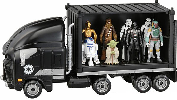 在後部收納貨櫃的車門是設計成透明材質讓你可以看見裡面收納的小車,官方並把自家所推出的小尺寸星戰人偶,也放入這輛黑武士展示收納卡車的後貨櫃當中來展示,讓這輛展示卡車有更多樣性的展示功能,拿掉後貨櫃箱也可以讓之前「STAR CARS」的產品停在上頭,無論是展示或是收納上面都具有美觀和多功能的實用性,喜愛《STAR CARS》系列的玩具人千萬別錯過囉!