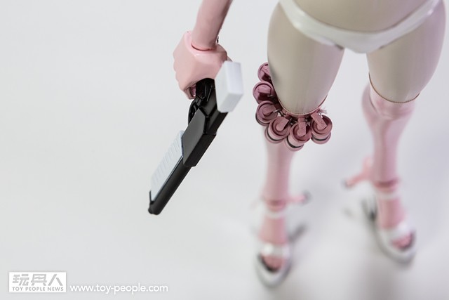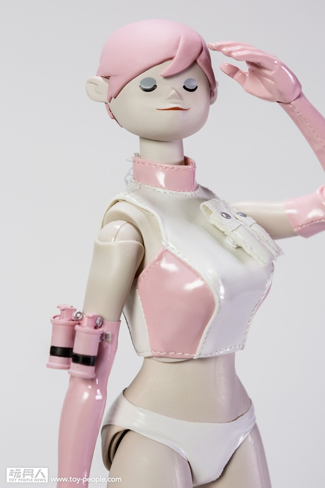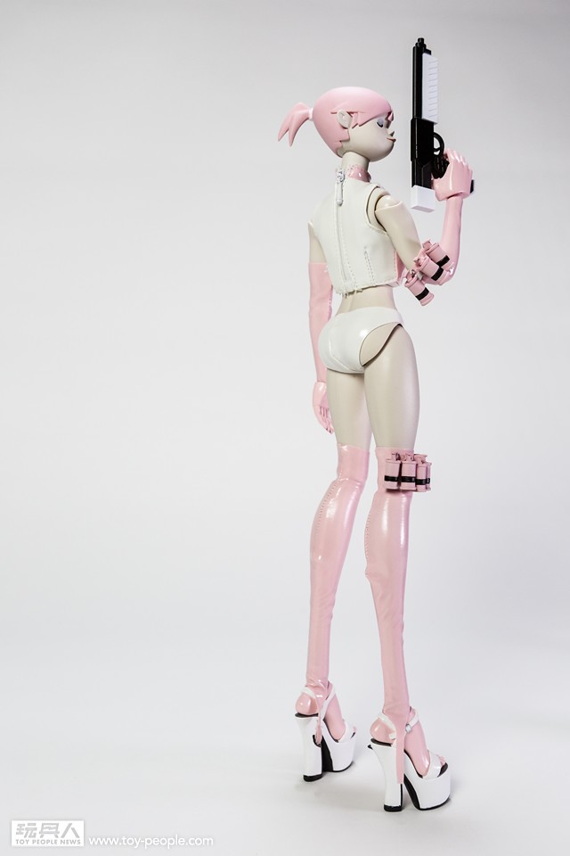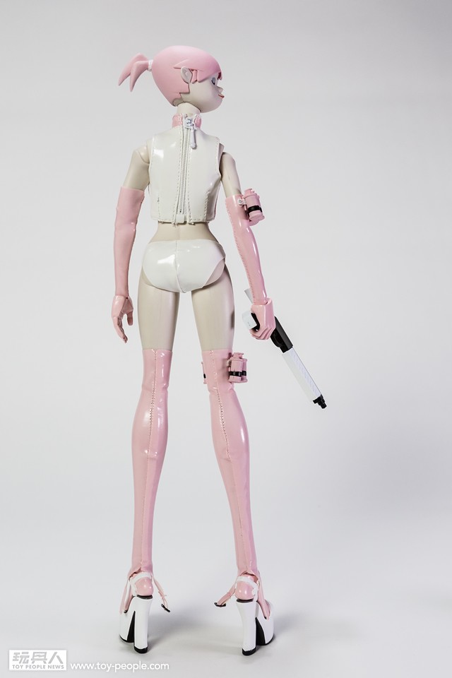 ▼ 這次的高跟鞋造型是採用白色高底的樣式,而threeA 這次在腳掌的顏色部分特別塗裝與長襪相同的粉紅色,而在小腿連接腳掌部的球狀關節部分亦採用粉紅色的設計,希望將皮質長襪的質感延伸,這個設計可說是非常細膩啊!