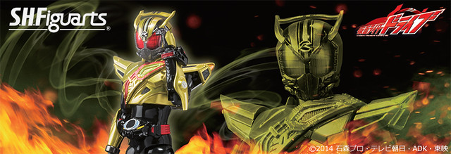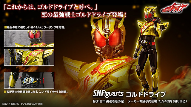 此次將劇中最強的敵人Gold Drive完整呈現,身上盔甲緻密的刻線和腳底細部的紋路等等,都精彩還原故事當中登場的模樣,作品附有交換用手首左右各4種和BannoDriver バンノドライバー配件可以替換來使用,在第46話所登場的「馬赫追擊者」也預計在這個月份推出,到時候就可以還原和Gold Drive最終決戰的模樣了啊!喜愛《假面騎士Drive》系列的玩具人可以參考一下歐。