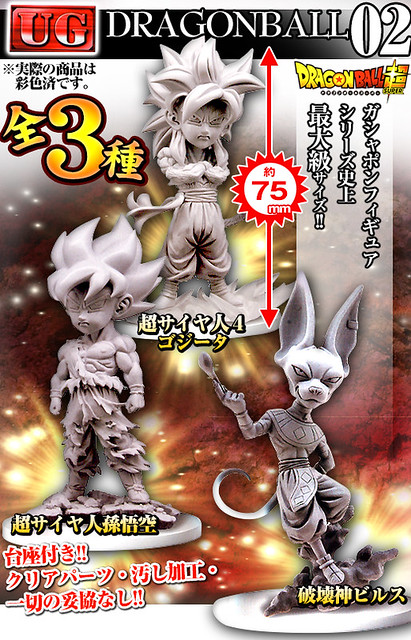 日BANDAI萬代玩具公司的轉蛋部門事業部GASHAPON以標榜著“超造型”和“超美色彩”的專用台座付屬的「究極七龍珠」UGドラゴンボール系列,來推出《七龍珠》動畫系列主題的轉蛋作品,此次將繼續推出其立體作第二彈,將悟空和格比達的頭髮部分使用透明材質來製作,呈現出轉變成為超級賽亞人時候「氣的提升」。