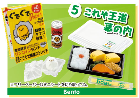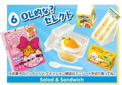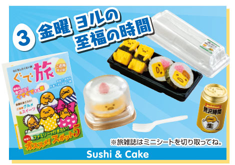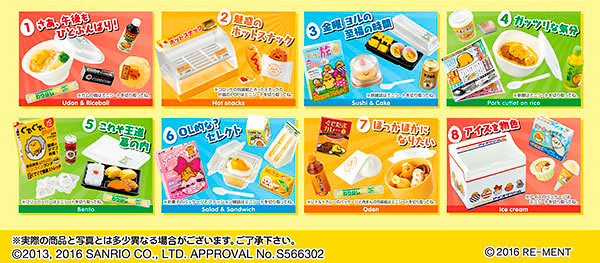 這次的八款作品有丼飯、炸物、壽司、蛋糕、三明治、冰淇淋等等超級可口的食物;值得注意的是,除了主餐之外,每款作品都會搭配著蛋黃哥相關的小配件,像是瓶裝飲料、罐裝飲料、報紙、雜誌等等。喜愛蛋黃哥的玩具人不要錯過啦!