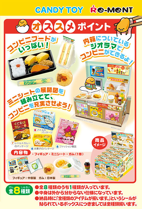 療癒界的天王「蛋黃哥」沉寂了一段時間之後又再度出發啦!由日本知名盒玩品牌RE-MENT 公司所推出的人氣角色「蛋黃哥」的最新盒玩作品:「蛋黃哥の 24 小時便利商店」(ぐでたま24hコンビニ)登場囉!!繼之前推出了蛋黃哥食堂、早安!蛋黃哥等食玩作品之後,RE-MENT 公司又要結合蛋黃哥與日本最知名的便利商店食物推出最新的盒玩作品了!看的寶寶肚子好餓啊!