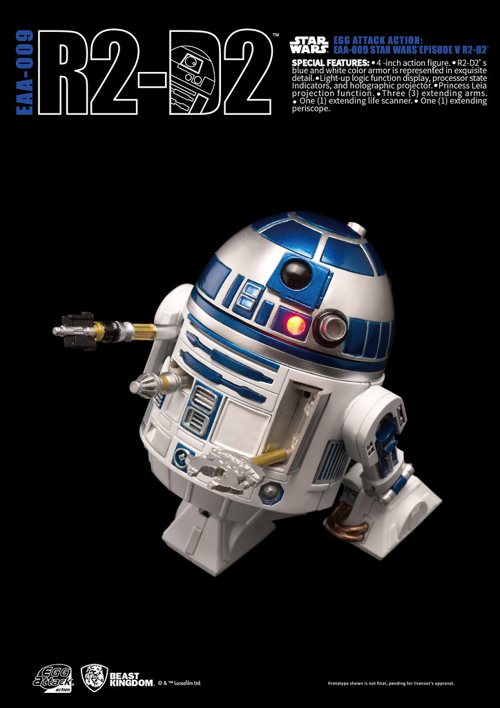 這次依照Egg Attack 風格所詮釋的R2-D2,以高度考究為背景,以小巧尺寸忠實地還原了原作中的造型設計,並附有大量的工具手臂、頭頂探測零件可供替換,呈現出原作中的經典造型。 除此之外,本作品最大的賣點,也是市面上R2-D2 主題作品首創的設計,內建了投影功能可以還原經典的莉亞公主求救圖像。