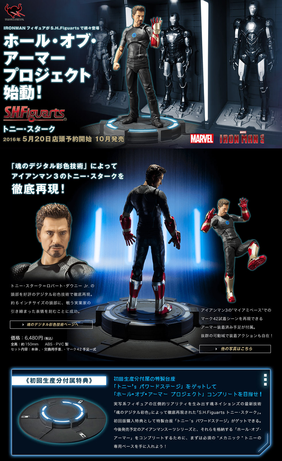 本作品首波特典將附屬一個實驗室場景地台「東尼的動力地台」(暫譯,Tony's Power Stage),這可是S.H.Figuarts 接下來將發行的「鋼鐵人裝甲格納庫計畫」系列作品中,不可或缺的重要道具! 各位想收集本系列的玩具人,千萬別錯過這一款作品~ 除此之外,先前獲得極高好評的S.H. Figuarts 「鋼鐵人」馬克42 也將配合一併再販。