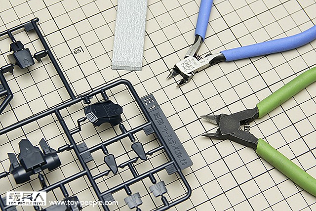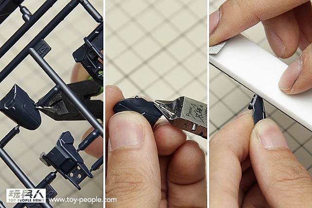 ▼先使用普通的斜口鉗,一樣必須採用兩段式剪法,先留大約1-3mm的距離。在剪第二段湯口時則使用「神之手斜口鉗」直接貼齊湯口做剪裁。由於神之手的銳利度比一般斜口鉗高出許多,剪完後的湯口也可以更平整,如果預算不夠也可以用一般斜口鉗做二段剪。剪平後再用模型砂紙將湯口消除。