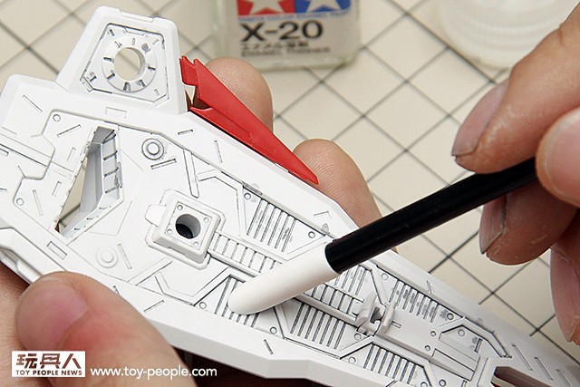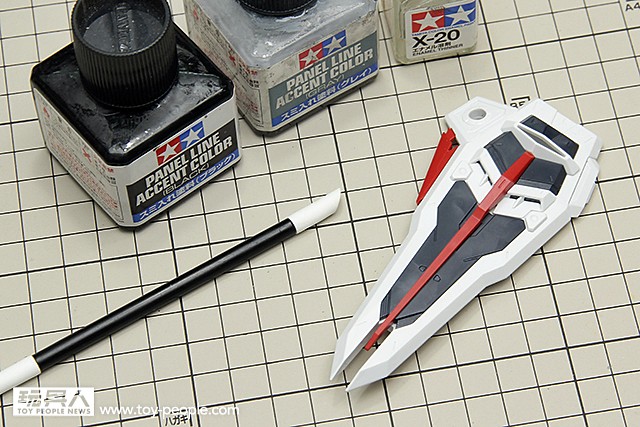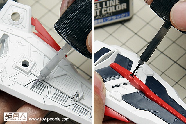 ▼使用灰色墨線液在白色零件上順著溝槽點入,如果用黑色點墨線反差會太大,看起來也不自然。紅色、藍色、深藍、灰色等地方則是用黑色的墨線液。