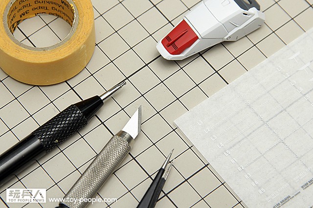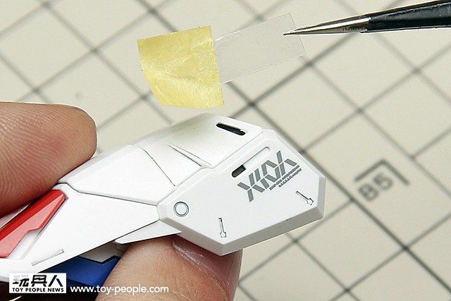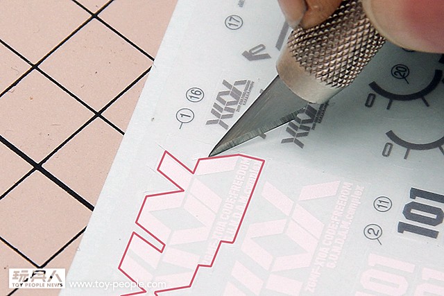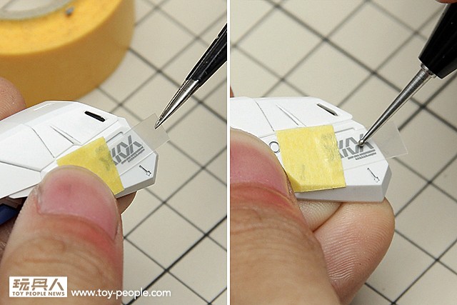 ▼先依照說明書把要貼的圖案用筆刀切下並對準在零件上,再用遮蓋膠帶做固定,以免轉印貼紙位移。再使用鐵壓筆將圖案來回刮在零件上。