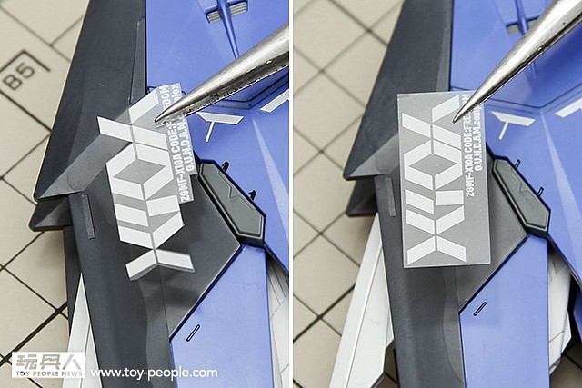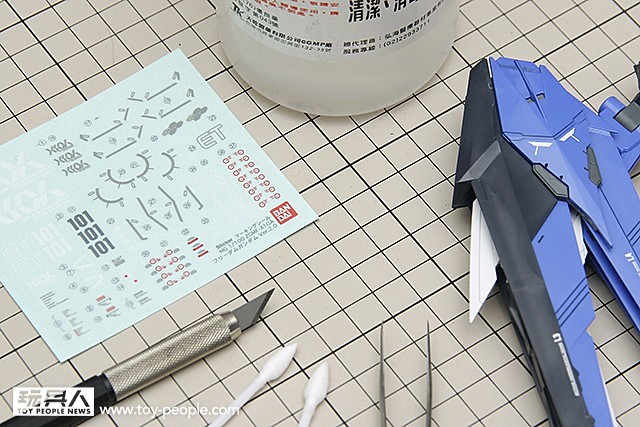 ▼答案就是貼紙嘍~自由鋼彈Ver.2.0共附有三種貼紙,分別是一般補色貼紙、轉印貼紙、透明貼紙。補色貼紙在這裡就不贅述了,在這裡要先介紹的是轉印貼紙的工具。