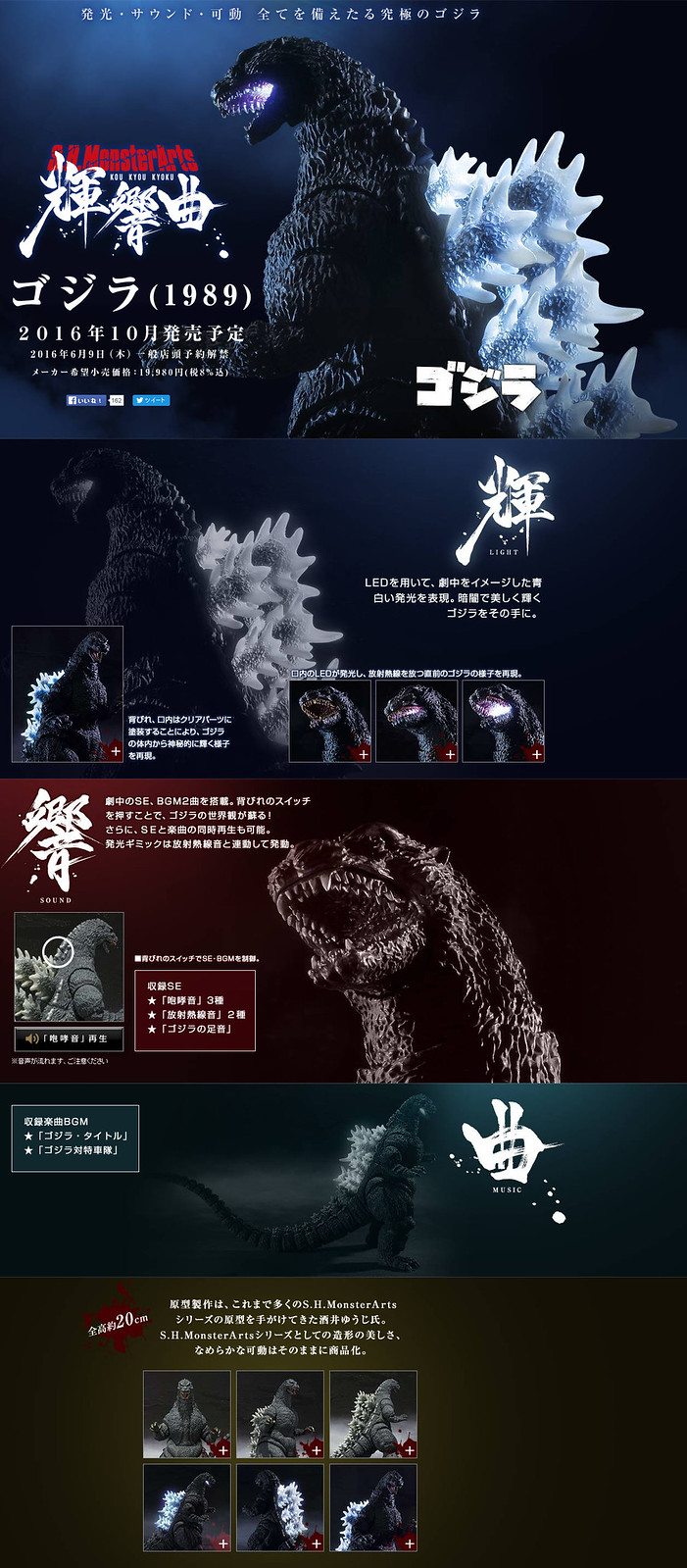 S.H.MonsterArts 輝響曲 系列,首波作品將推出最具有人氣的1989年版哥吉拉。藉由S.H.MonsterArts 系列多年來所累積的可動技術,由本系列知名的原形師「酒井裕司」(酒井ゆうじ)操刀製作,讓本作品保有同時能夠兼具細緻外型與靈活可動性,光是本體就具有超高水準的把玩性與展示性,而“輝響曲系列” 則是以此為基礎再加上了系列作中的三大嶄新功能來作為命名: