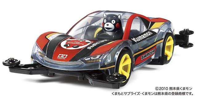 日TAMIYA田宮玩具公司之前以人氣吉祥角色“熊本熊”來推出其「熊本熊四驅車」十分受到喜愛熊本熊的玩具人們喜愛,這次4月在日地震災害所受到嚴重傷害的熊本縣,玩具公司特別出「加油! 熊本縣」 熊本熊版本的迷你四驅車がんばれ!熊本 ミニ四駆 (くまモン版)名稱暫譯,以特殊透明又輕材質的車殼設計,加上有賽車塗裝等等。
