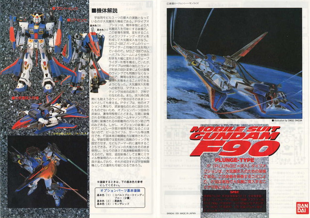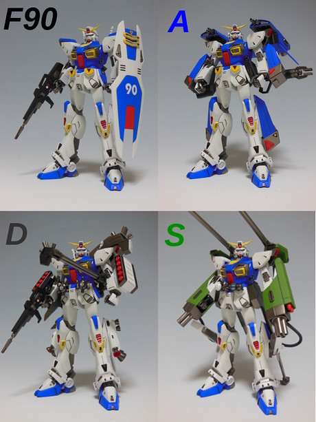 1990年發售的1/100鋼彈F-90,一盒之中除了基本型態之外,並附有A型(Assault Type長距離侵攻仕様)、D型(Destroyed Type接近壓制戰仕樣)與S型(Support Type長距離支援仕樣)三種武裝系統,三個願望一次滿足。 同時推出的還有P型(Plunge Type大氣圈突入仕樣),可變形成為像Z鋼彈的Wave Rider型態。