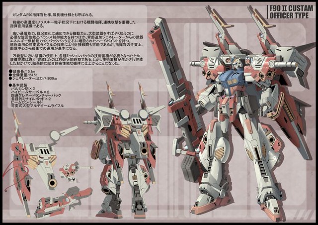 同時推出的還有P型(Plunge Type大氣圈突入仕樣),可變形成為像Z鋼彈的Wave Rider型態。 這張圖是同人二創的F-90II原創設定武裝。事實上,包括F-90和F-90II,官方設定的任務包總共有26種,但到目前為止,真正被立體化的只有不到10種。