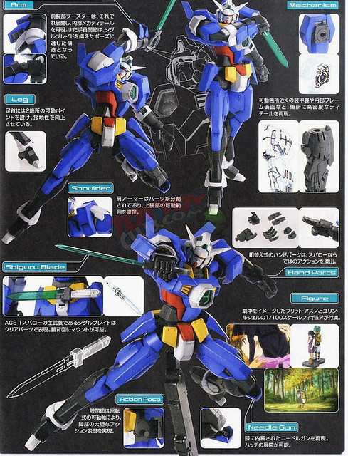 鋼彈AGE-1基本型,能透過AGE系統進行換裝,發揮出各種武裝的不同性能。 鋼彈AGE-1T重擊型(Titus),格鬥戰特化模式,它的雷射金臂勾、雷射膝撞和雷射肩,都具有強大的打擊能力。