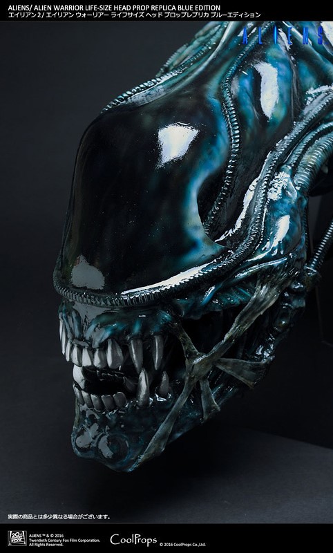異形戰士最大的特色在於牠的頭骨形狀以及7-8 尺高的身高,因此這次CoolProps 品牌所呈現的1:1 比例電影道具複製頭像可說是非常的龐大啊!而在色調上採用深藍色的概念主要是因為在電影中,當雷普利少尉再次登陸LV-426 殖民地時,在黑暗中照到異形戰士時的色調是呈現灰色、藍色的樣貌,所以也特別推出了這次藍色版本的異形戰士複製頭像設定。