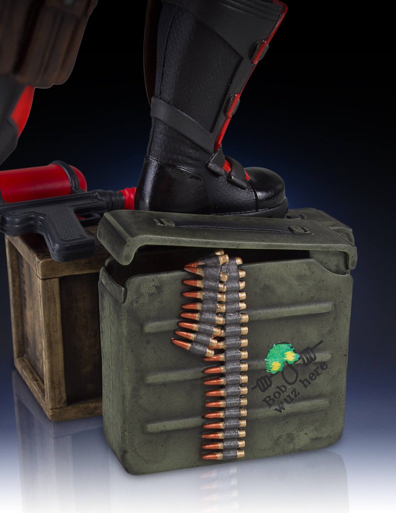 這次Gentle Giant 公司所要推出的「死侍」全身雕像作品可說是非常的精采啊!整體的裝束以漫畫的設定為主,而在左手的部分拿著一把火箭推進榴彈(RPG),腳踩在彈藥箱上。其招牌的雙刀也在背後完整呈現,腿上也有一把小刀,而在槍枝的部分,全身也放置了三把手槍,加上手榴彈等可說是一個行動彈藥庫啊!超級帥氣,喜歡MARVEL 超級英雄的玩具人不要錯過了!