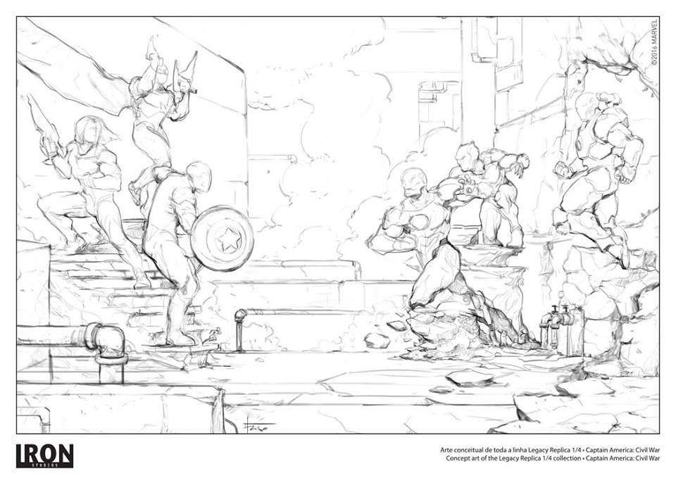 值得一提的是,Iron Studios 工作室有公佈一張手繪的草圖,從圖中可看出之後非常有機會推出一款超強大的巨型戰鬥場景啊!會推出包含美國隊長以及鋼鐵人陣營的角色,而當所有雕像都收集完則可以拼湊成一幅巨型的雕像作品呢。喜愛MARVEL 超級英雄的玩具人絕不能錯過啊!