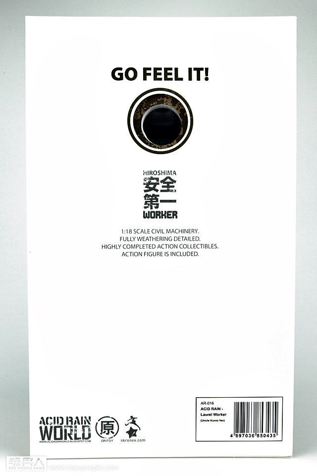 ▼ 包裝背面。酸雨戰爭中的每支部隊都有其象徵的隊徽或符號,即便是工程用機甲也不例外,廣島重工的是「安全第一」的字樣。雖然在煉獄般中的戰場存活了下來,但是在被戰爭破壞殆盡的斷垣殘壁中,還是要小心警慎注意安全。