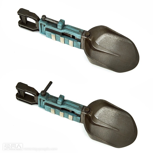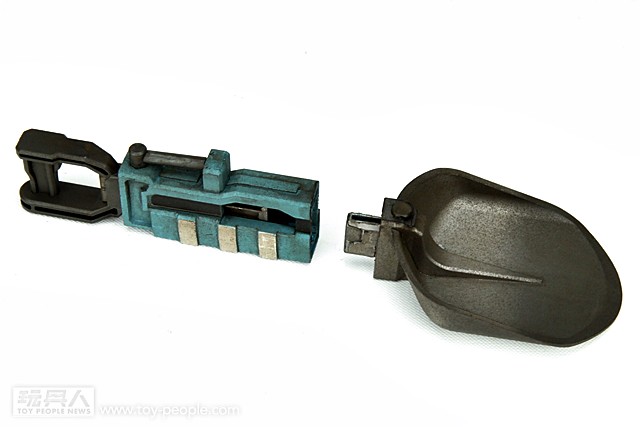 ▼ 組裝完成的鋼鏟,中後段有一個可轉動的把手,打開之後能夠將鋼鏟裝備在原本Laurel 機甲裝備火神機砲的位置,方便攜帶。