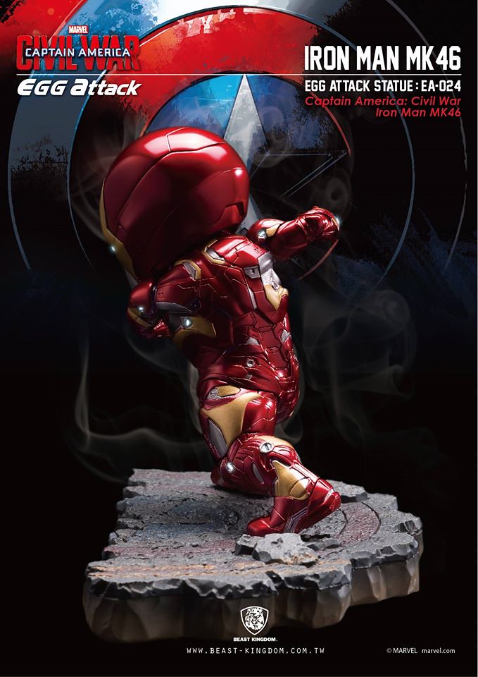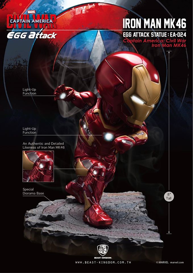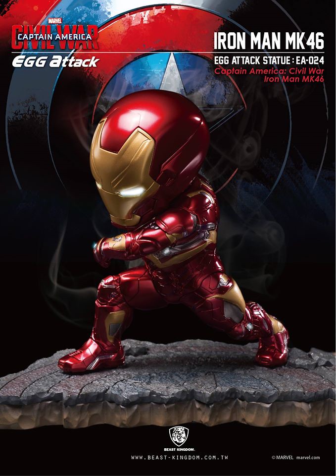 繼EA-023 的美國隊長雕像作品之後,野獸國又將要在其Egg Attack 系列推出另一款電影「美國隊長3:英雄內戰」(Captain America: Civil War)中最新登場的鋼鐵人裝甲「馬克46」(Iron Man MK46)的作品。其在電影的設定中,是在復仇者聯盟2:奧創紀元中蘇科維亞戰役之後,東尼.史塔克所打造出來最新的鋼鐵裝甲。