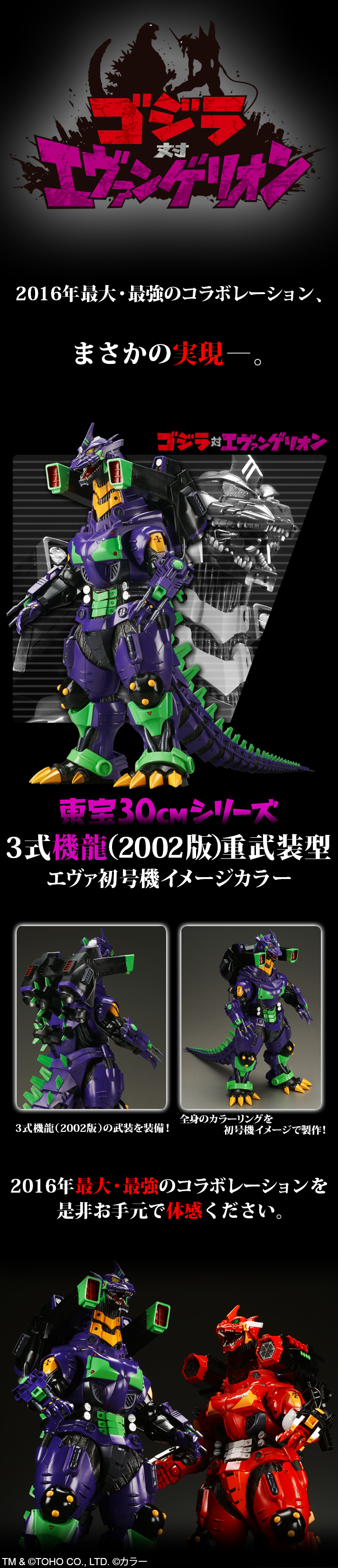 夢幻的聯名終於實現商品化! 超高人氣動畫《新世紀福音戰士》導演“庵野秀明”執導的哥吉拉最新電影《真‧哥吉拉》,啟動了聯名宣傳企畫《哥吉拉VS福音戰士》,推出了最新的聯名商品!繼機械哥吉拉初号機VER、S.H.MonsterArts 哥吉拉 feat.EVA-01之後,最新立體化作品將推出3式機龍(2002版) 重武裝型 EVA初號機配色 以及 3式機龍(2003版) 重武裝型 EVA2號機配色!