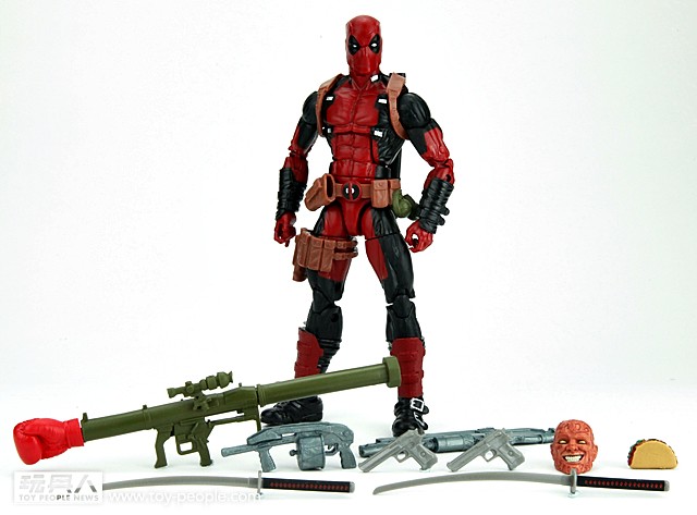 ▼ 真不愧是死侍!這次記得帶武器了!但是身為系列作的角色,居然完全沒有BAF零件... 武裝配件的部分相當豐富,包含一把步槍、裝彈豉的霰彈槍、兩把手槍、一把小刀、兩把武士刀,以及一把發射拳擊手套的火箭筒??? 另外還附有一個素顏頭雕,以及一個死侍最愛的食物 - 墨西哥捲餅(Chimichanga)