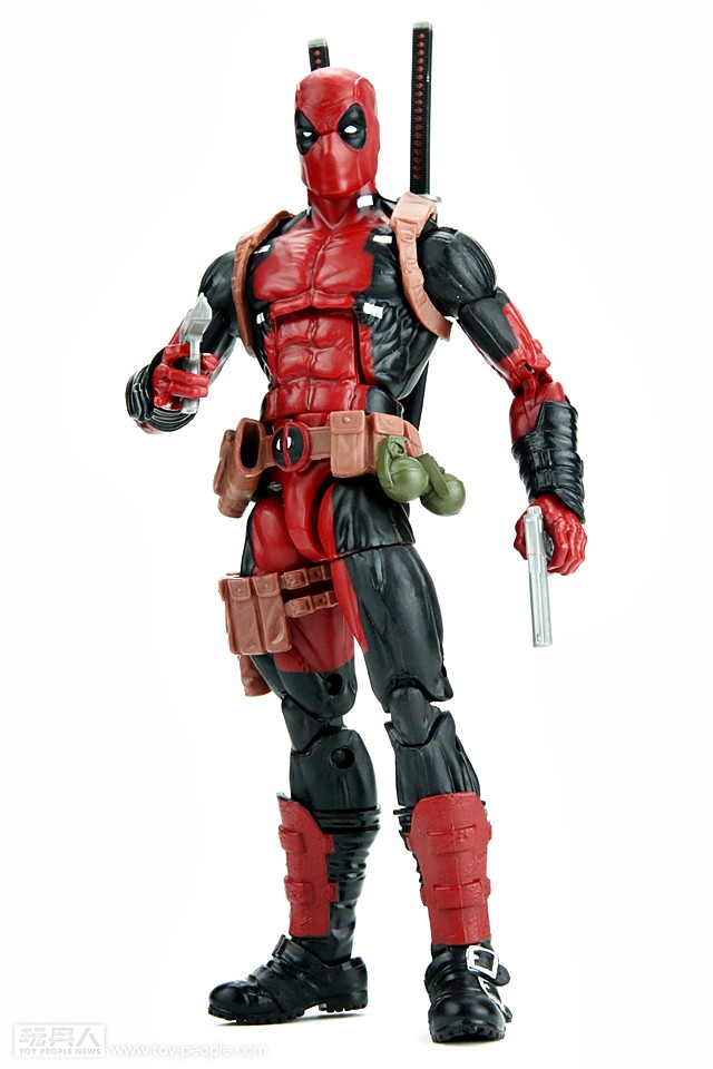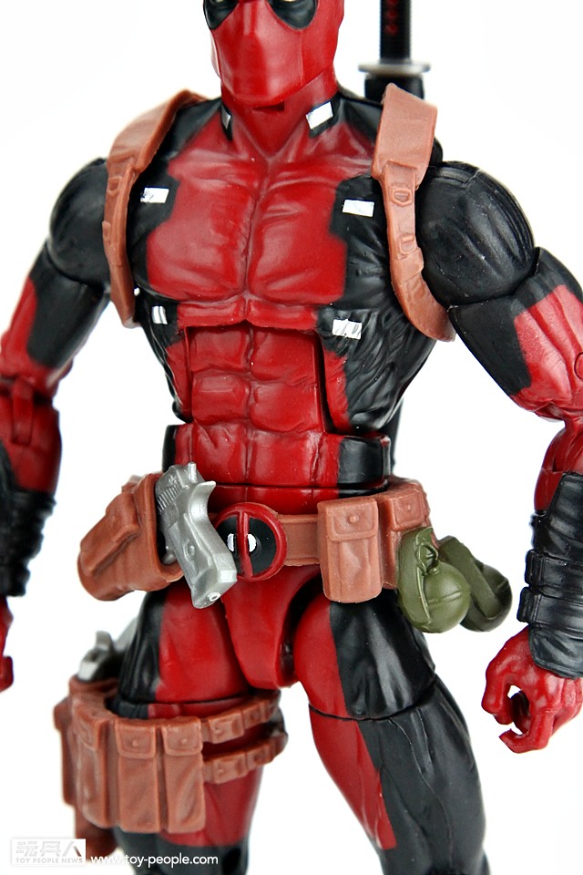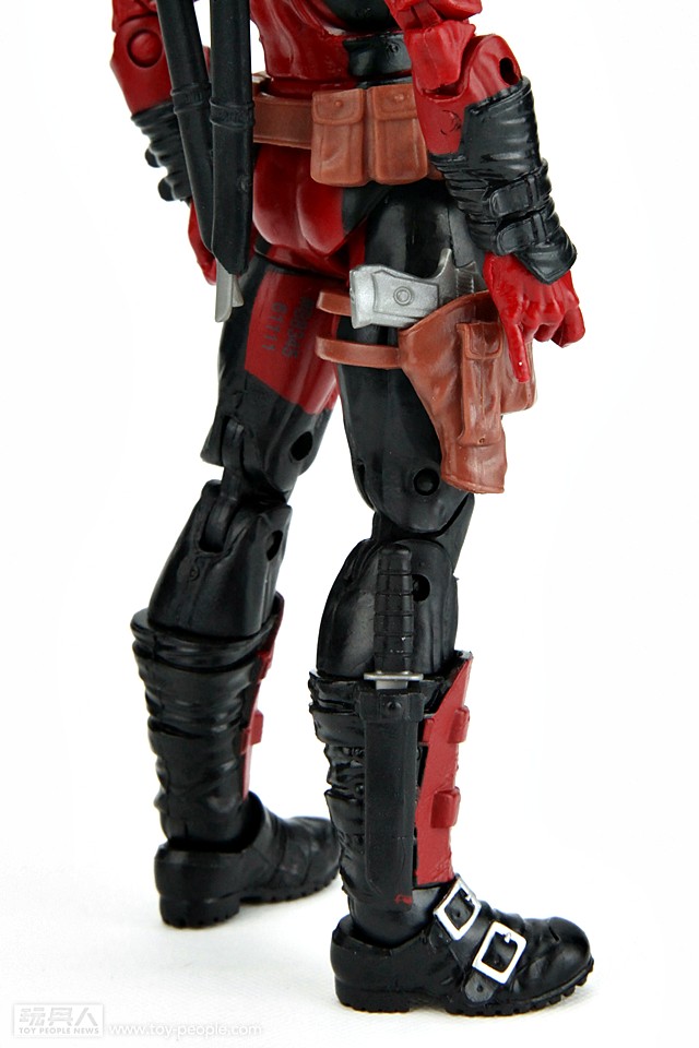 ▼ 全副武裝的造型。除了武器之外,死侍身上還有大量的彈袋以及腰間的兩顆手榴彈(不可拆下)。兩把手槍可收納於腰間與腿側的槍套中,小刀能夠收納於小腿的刀鞘。