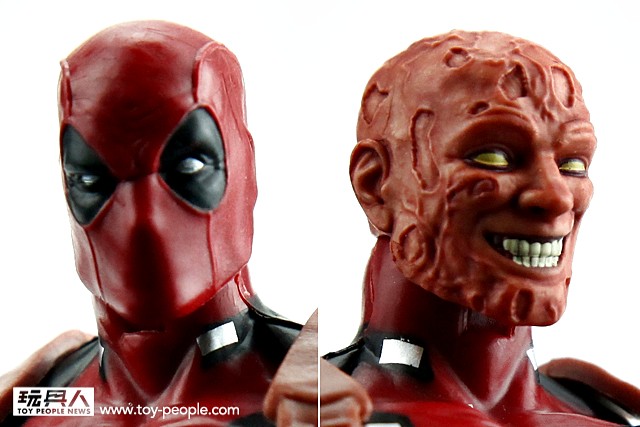 ▼ 死侍的兩款頭雕都十分的用心,面罩頭雕採用了經典的大小眼挑眉神情,而爛臉版則是瘋癲的大笑造型(笑得多燦爛啊~),臉部的傷疤完全是採用造型+塗裝,而不是僅塗裝而已。