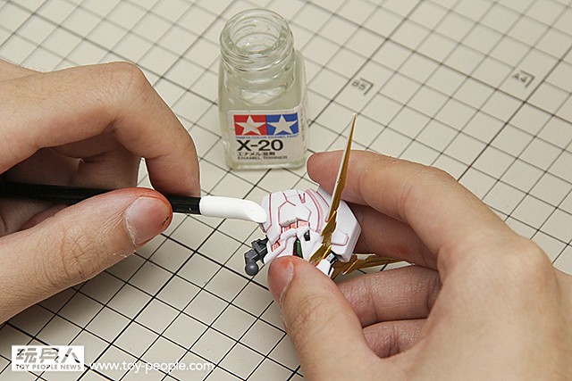 ▼ 這邊要注意,由於琺瑯漆會侵蝕獨角獸鋼彈的白色材質,在點墨線的過程中,會難以擦拭,所以在點墨線時要小心不要讓顏料到處亂流。